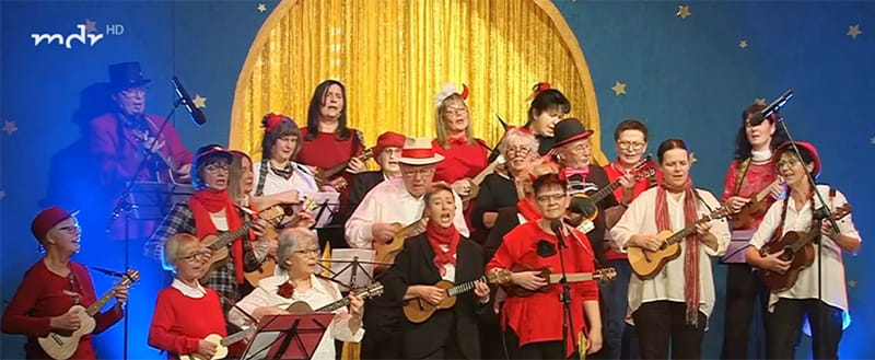 Das Ensemble wurde bis 2019 von mir geleitet und es gibt sie aus Freude am Ukulelespiel heute noch. Es ist eine offene Gruppe, mal größer oder kleiner. Aber immer halten 6 bis 7 Stammspielerinnen die Ukulele hoch, den Keller warm und fürchten sich vor nichts. Sie spielen alles, von der Sopranukulele bis zur Bariton, vom einfachen deutschen Schlager aus den 60ern bis zum „ausgefeilten“ Let it be.
